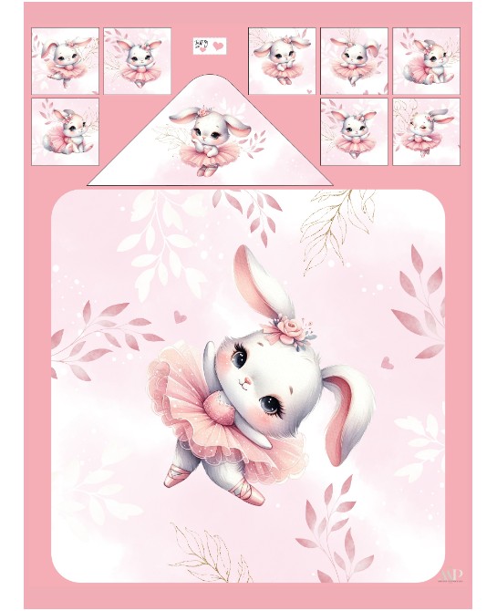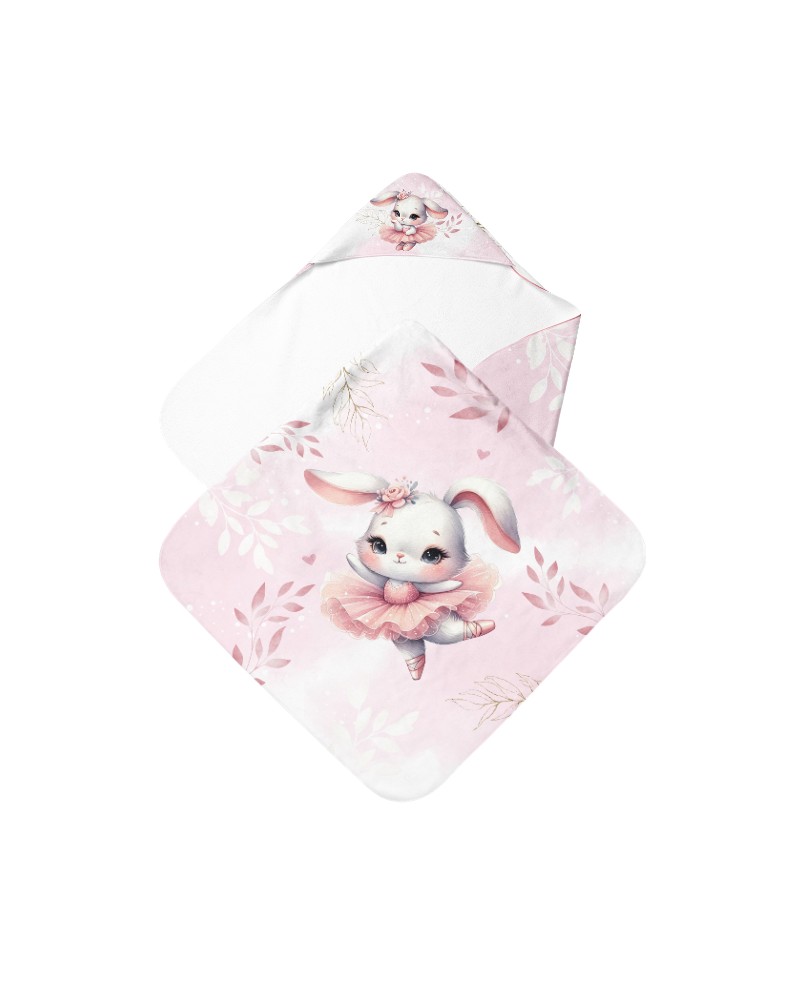 Cette cape de bain bébé met à l’honneur un adorable lapin ballerine, illustré dans un style aquarelle doux et délicat. Le motif s’entoure de feuillages légers et de petits cœurs dans des tons rose poudré et beige, créant un univers tendre, poétique et élégant.