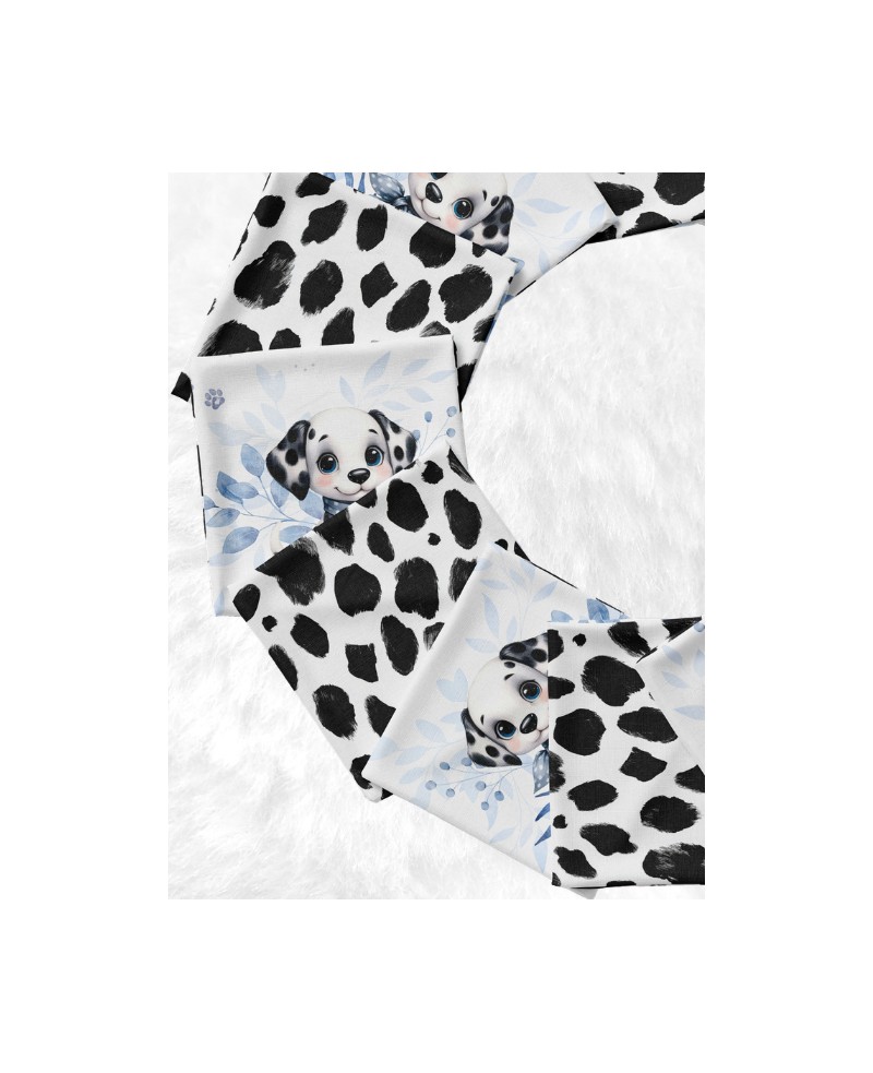Il se compose de 10 carrés de 12 × 12 cm, illustrés d’un univers doux et intemporel autour du dalmatien : adorables chiots aux grands yeux expressifs, associés à des motifs de taches noires emblématiques et quelques touches végétales délicates dans des nuances de bleu poudré.