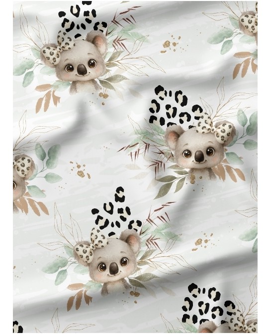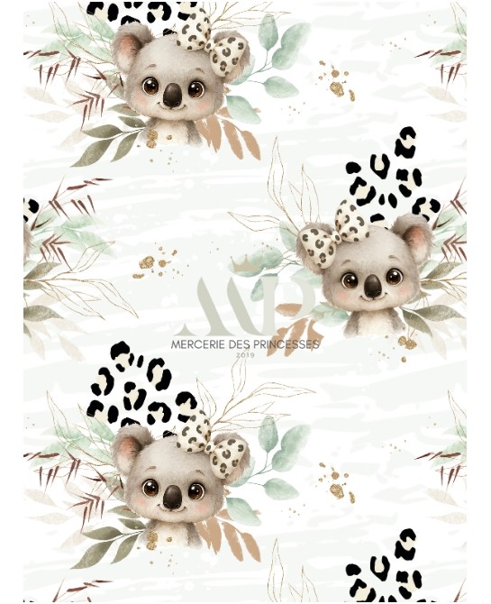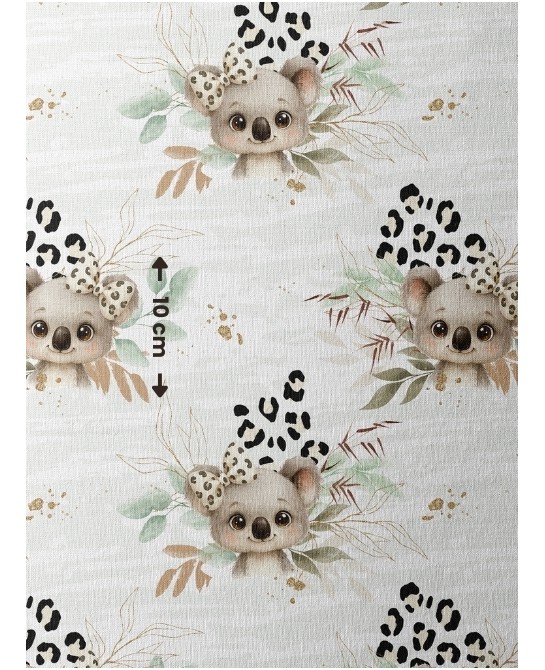Ce tissu met en avant un motif tendre et original : de charmants petits koalas dessinés dans un style aquarelle, coiffés de nœuds et ornés de détails au motif léopard. Autour d’eux, des feuillages délicats dans des teintes vert tendre et brun automnal ajoutent une touche bohème et naturelle.