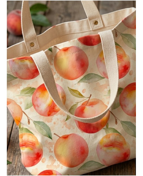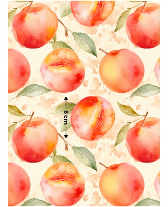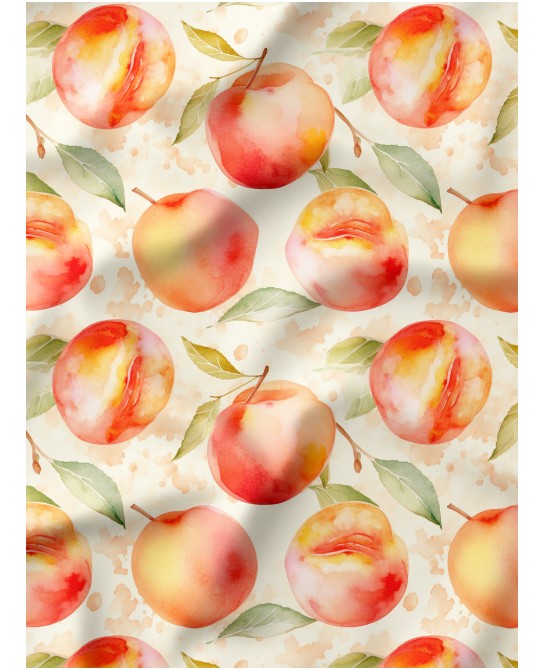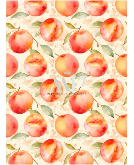 Plongez dans une atmosphère douce et lumineuse avec “Douceur de Pêche”, un motif délicat où de jolies pêches aquarellées se mêlent à un feuillage léger aux teintes naturelles. Sur un fond clair, chaque élément semble posé avec légèreté, créant une ambiance fraîche, gourmande et apaisante.