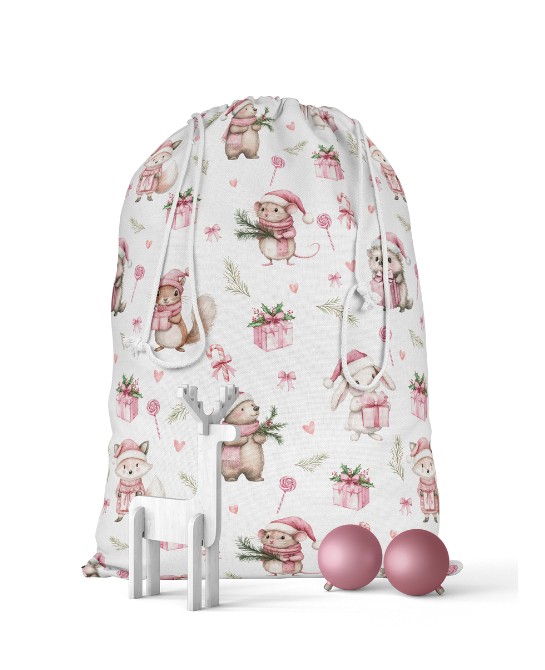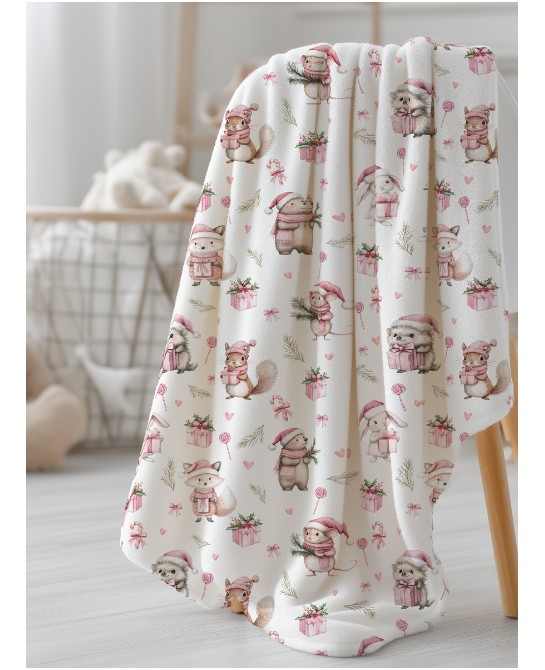 Sur un fond blanc lumineux se dessinent de charmants ours, renards, lapins, hérissons et écureuils, délicatement illustrés dans un style aquarelle pastel. Chaque détail respire l’esprit de Noël et l’élégance d’une ambiance festive aux tons poudrés.