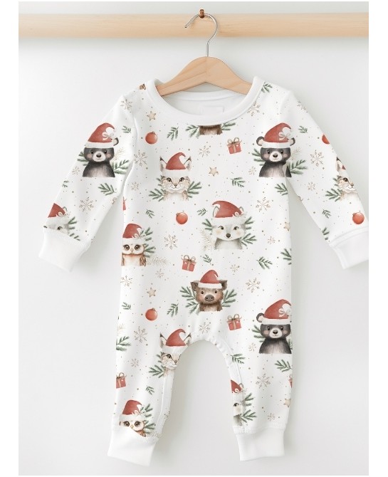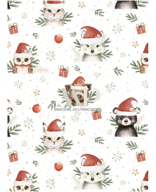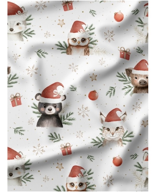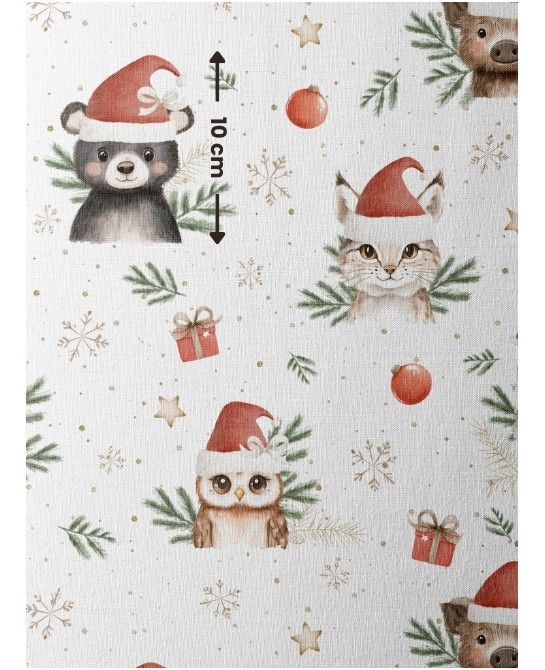 Ce tissu festif met en scène de charmants animaux de la forêt – hibou, renard, sanglier, ourson et raton laveur – coiffés de bonnets rouges de Noël. Ils sont entourés de branches de sapin, cadeaux, étoiles et boules décoratives, le tout illustré dans un style aquarelle tendre et chaleureux.