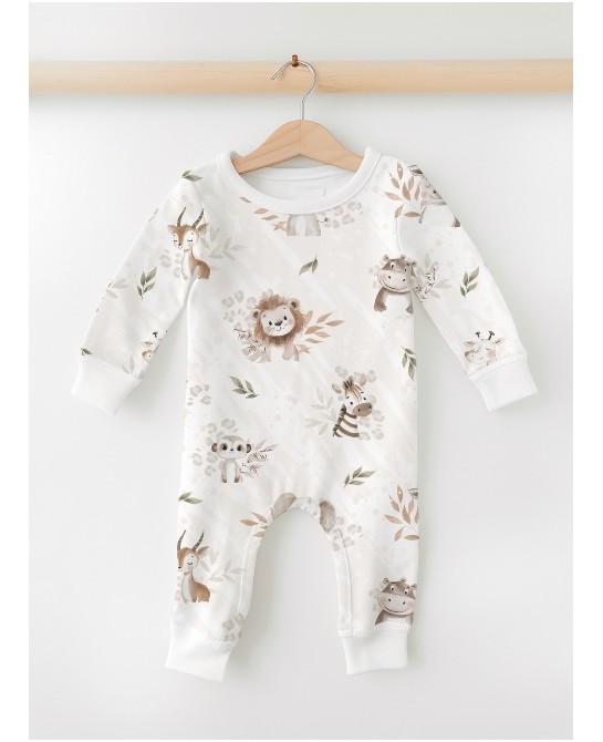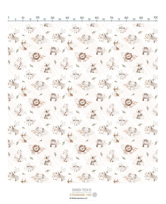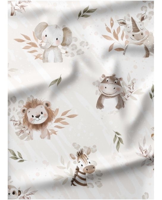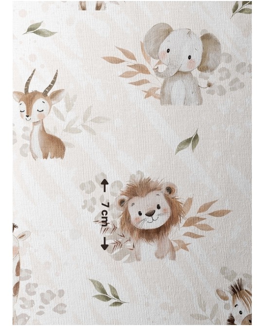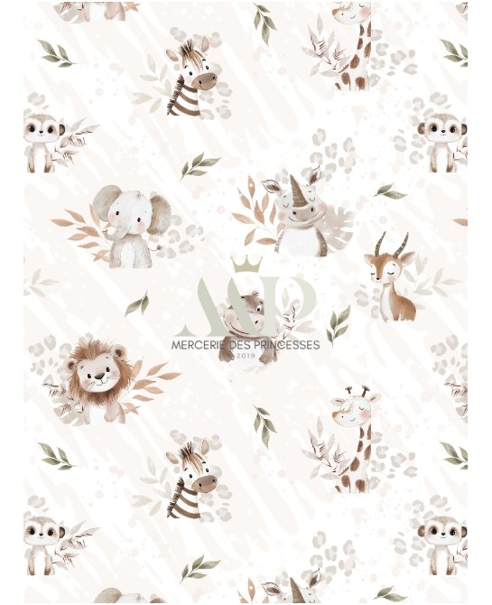 Apportez une touche tendre et exotique à vos créations avec le tissu coton imprimé Douceur de la Savane. Son motif poétique illustre de charmants animaux – éléphants, lions, girafes, zèbres, hippopotames, gazelles et rhinocéros – dans des tons doux et naturels, accompagnés de feuillages délicats sur un fond beige subtil. L’ensemble crée une ambiance apaisante et chaleureuse, idéale pour les projets couture enfantins.