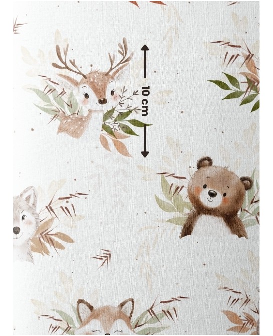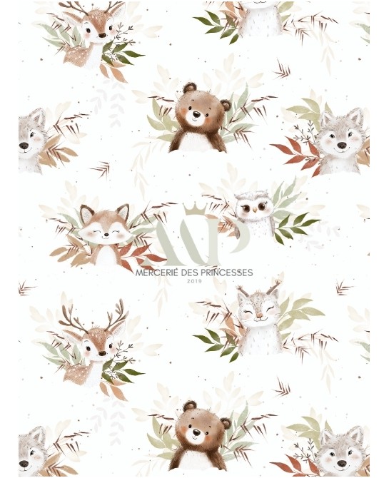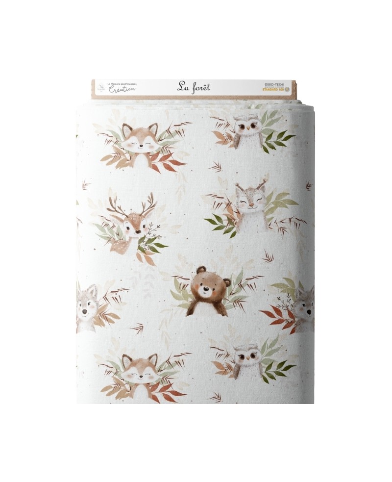 Plongez dans un univers tendre et enchanteur avec ce tissu au design exclusif mettant en scène de jolis animaux de la forêt : renard, hibou, faon, ourson et lynx, tous illustrés dans un style aquarelle doux et poétique. Les motifs sont entourés de feuillages aux teintes naturelles — vert, terracotta, beige — sur un fond blanc cassé, apportant une ambiance bohème, nature et chaleureuse. Idéal pour les créations destinées aux enfants, ce tissu imprimé évoque la magie de la forêt et la douceur des animaux sauvages dans un esprit scandinave et apaisant.