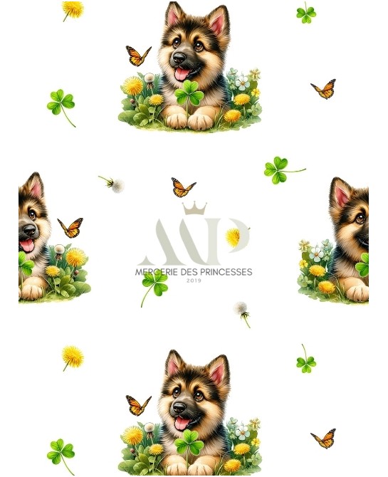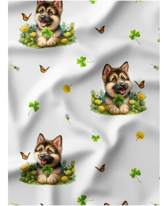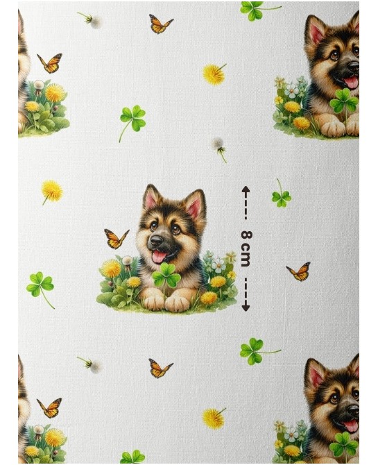 Ce tissu imprimé met en scène un adorable chiot berger allemand entouré de fleurs, trèfles et papillons, sur un fond blanc lumineux. Le motif est doux, enfantin et équilibré, parfaitement adapté à l’univers des enfants et à la décoration de chambre. Les couleurs naturelles – bruns chaleureux, verts tendres, jaunes lumineux et touches orangées – apportent une ambiance fraîche et rassurante.