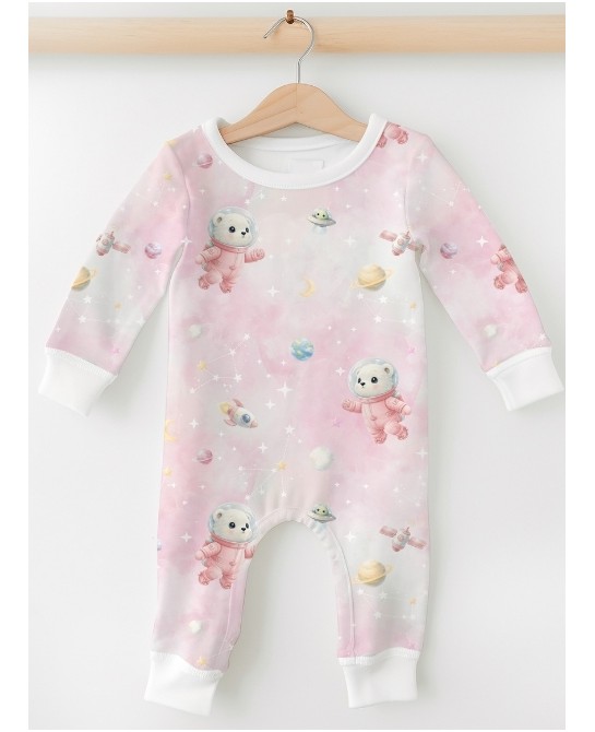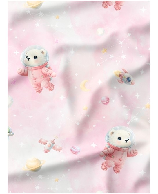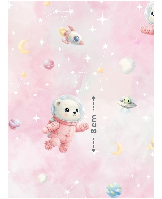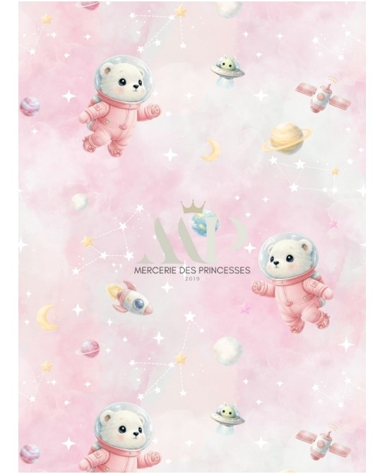 Ce tissu délicatement illustré transporte petits et grands dans un univers céleste rempli de tendresse et de poésie. Sur un fond rose poudré aux nuances d’aquarelle, de charmants oursons astronautes vêtus de combinaisons roses flottent dans l’espace, entourés de planètes pastel, de petites étoiles, de lunes dorées et de fusées amusantes. L'ensemble évoque une ambiance onirique et rassurante, parfaite pour les tout-petits.