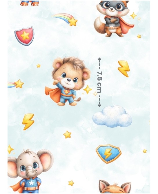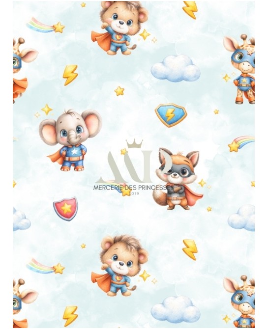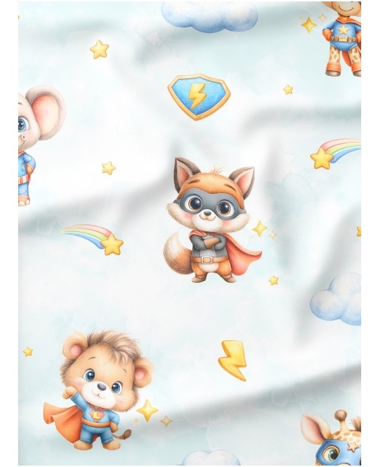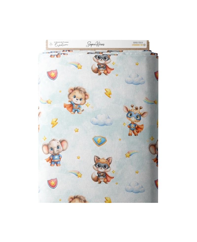 Avec le tissu « SuperHéros », l’imagination prend son envol dans un monde ludique et courageux. Sur un fond bleu ciel doux et nuancé, d’adorables animaux déguisés en super-héros prennent vie : un lion courageux, une girafe malicieuse, un raton laveur futé, une souris intrépide… Tous vêtus de capes colorées, masques rigolos et costumes étoilés. Entre arcs-en-ciel, éclairs, étoiles et boucliers, le décor évoque un univers joyeux et rempli d’énergie positive.