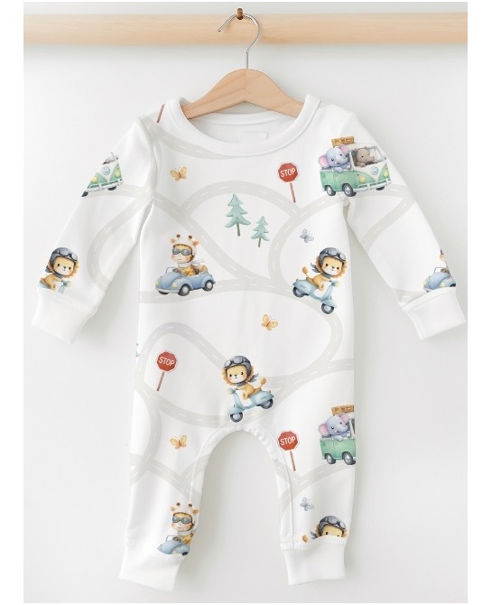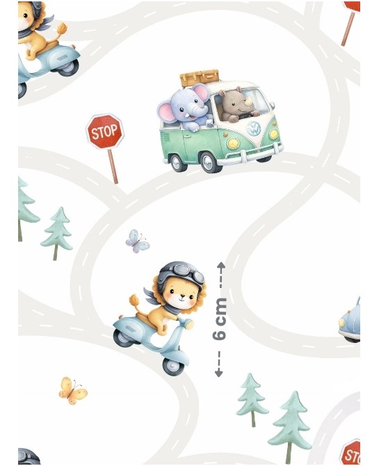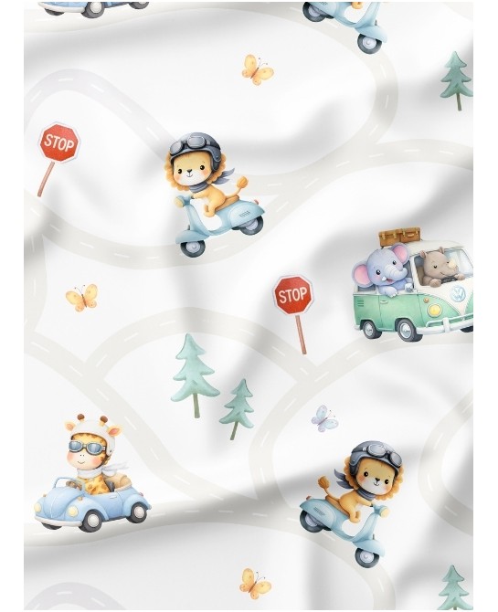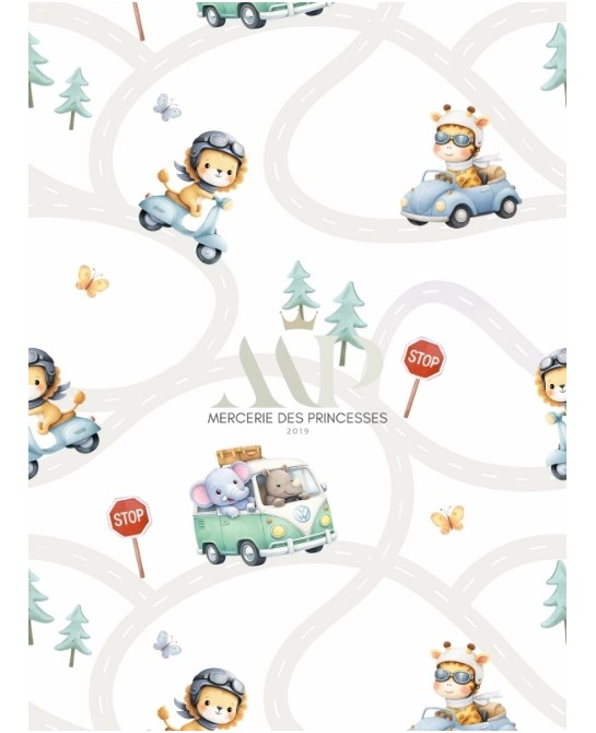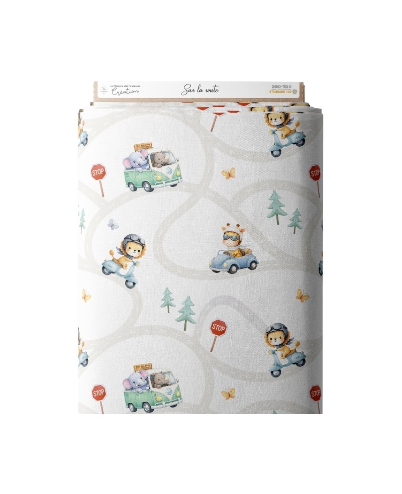 Avec le tissu « Sur la route », chaque création devient une escapade pleine de tendresse et de fantaisie. Sur un fond écru parsemé de routes sinueuses couleur sable, d’adorables animaux prennent le volant : un lion intrépide sur sa trottinette vintage, une girafe au volant d'une petite voiture, et une joyeuse bande d’amis (éléphant, ours et lapin) à bord d’un minibus vert d’eau. Le tout est ponctué de panneaux "STOP", de sapins stylisés et de papillons dorés, créant une ambiance ludique, douce et pleine de mouvement.