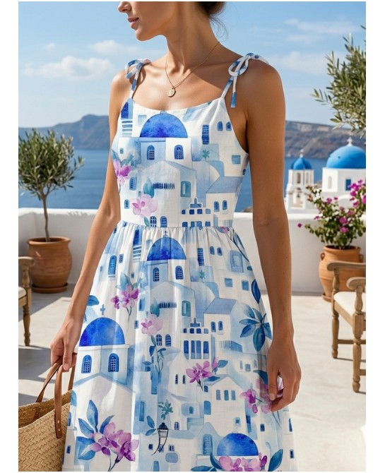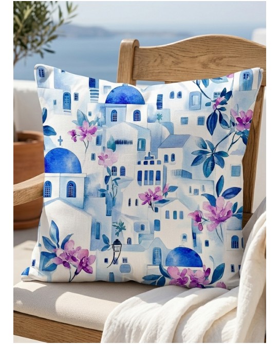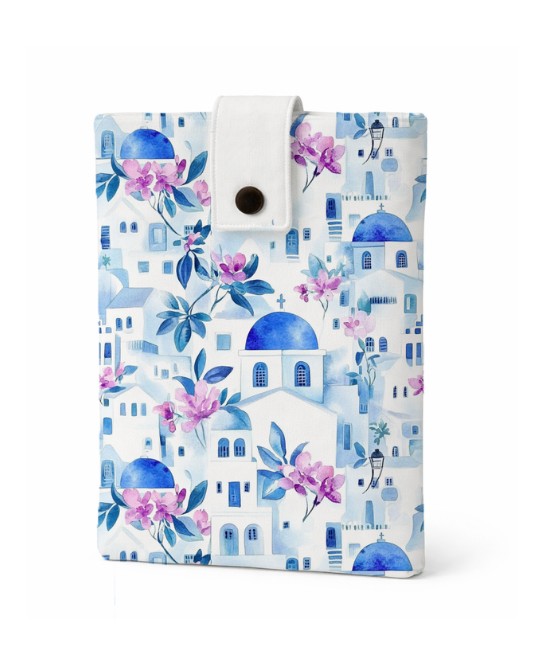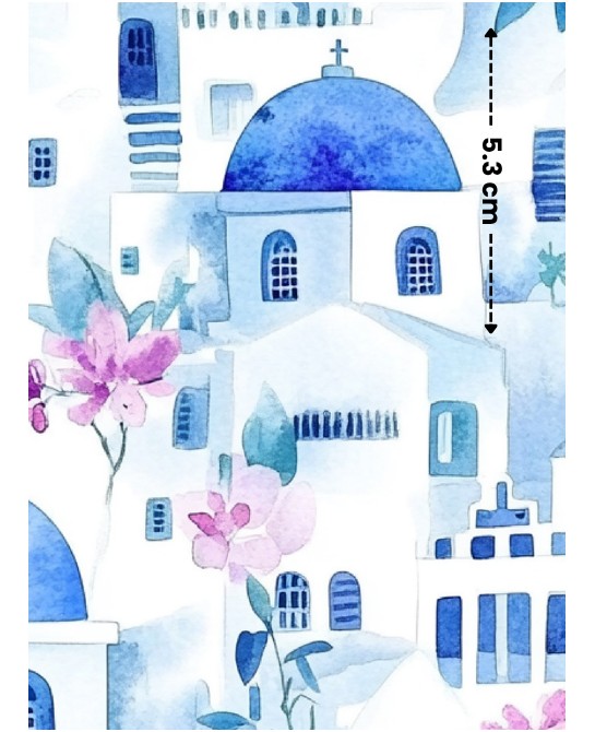Laissez-vous transporter par le charme envoûtant de “Santorin”, un motif inspiré des paysages emblématiques des Cyclades. Maisons blanches immaculées, dômes bleus iconiques et ruelles baignées de lumière se mêlent à de délicates touches florales pour créer une scène douce et dépaysante.