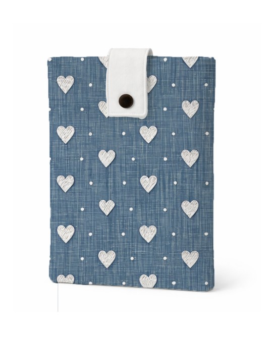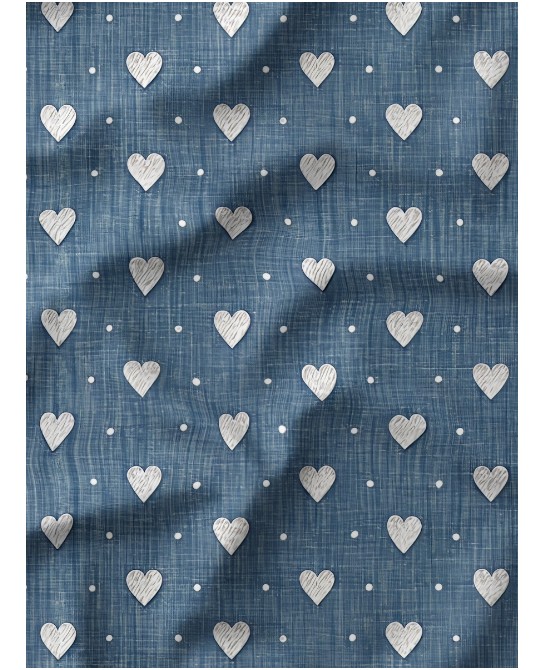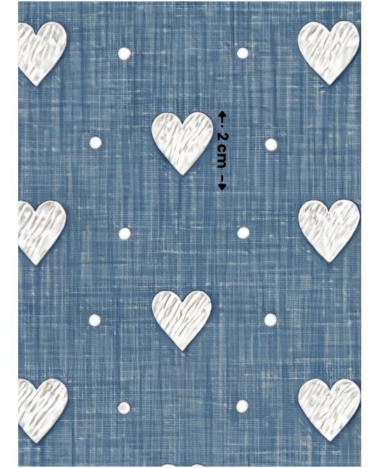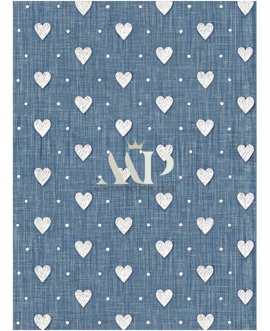 Laissez-vous séduire par le charme doux et intemporel de “Denim Cœurs”. Sur un fond effet jean subtilement texturé, de petits cœurs blancs délicatement dessinés s’accompagnent de pois discrets pour une composition à la fois tendre et moderne.