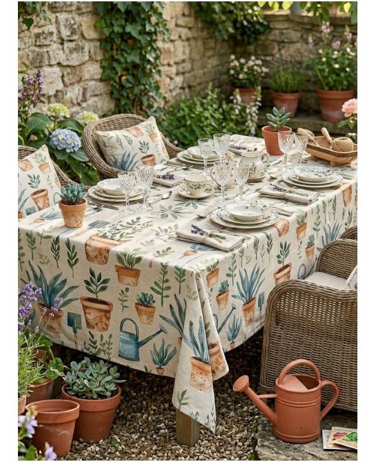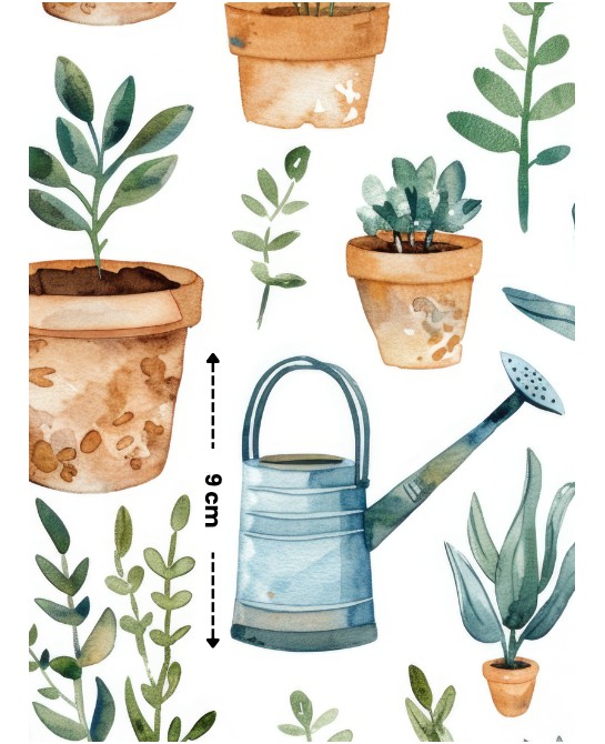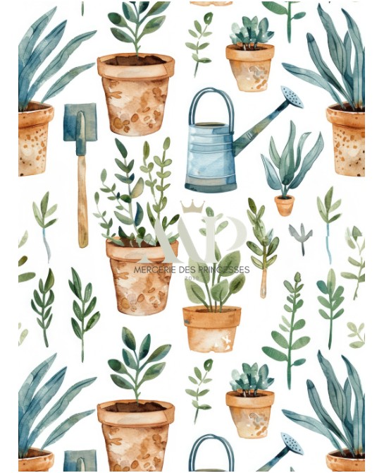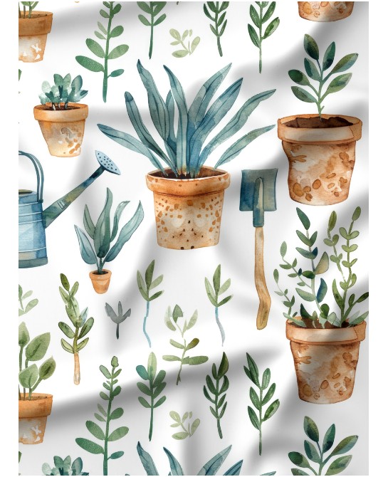 Plongez dans l’univers Jardinage, un motif à l’aquarelle frais et apaisant où plantes en pots, feuillages délicats et outils de jardin se mêlent dans une composition douce et harmonieuse. Sur fond clair, les verts naturels et les tons terre cuite créent une ambiance végétale, simple et élégante.